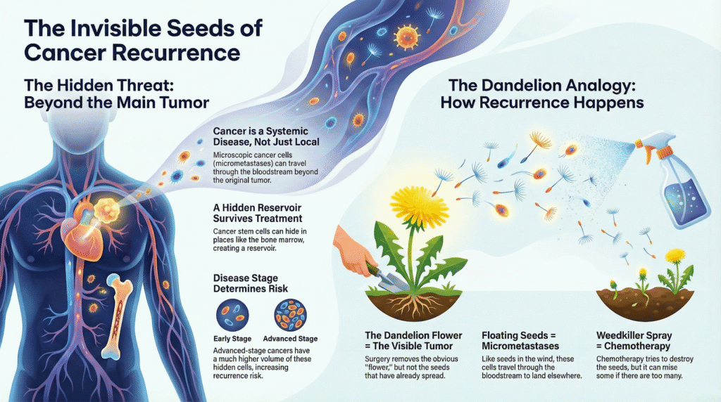 Takeaway: Cancer recurrence is driven by these “invisible seeds.” While early detection helps chemotherapy eliminate them effectively, understanding this mechanism highlights why doctors insist on regular follow-ups and scans even after you are “cancer-free.”